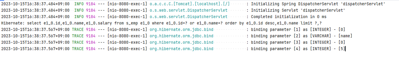 logging: level: org.hibernate: orm: jdbc: bind: trace결과