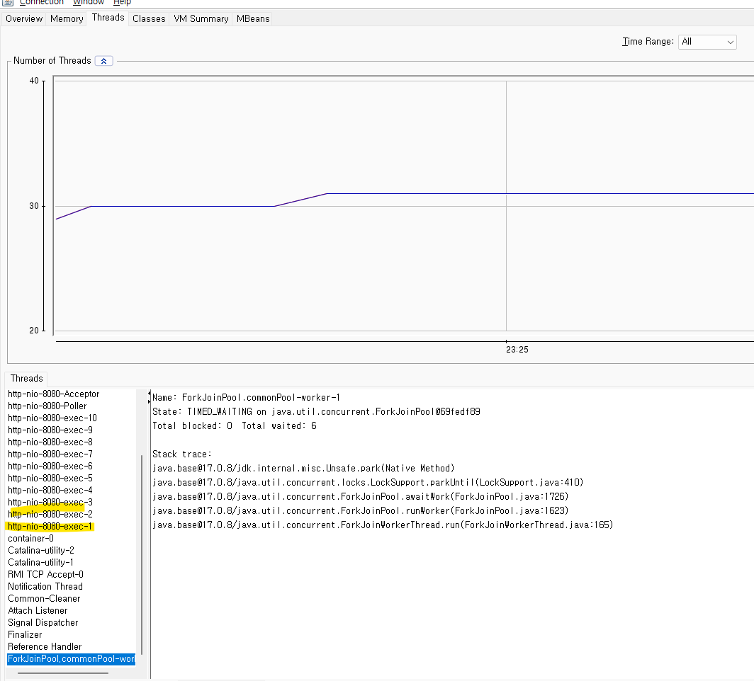 - 처음 서버를 가동한 다음에 생성된 스레드를 찾아보면 ForkJoinPool을 찾아볼 수 없다.
