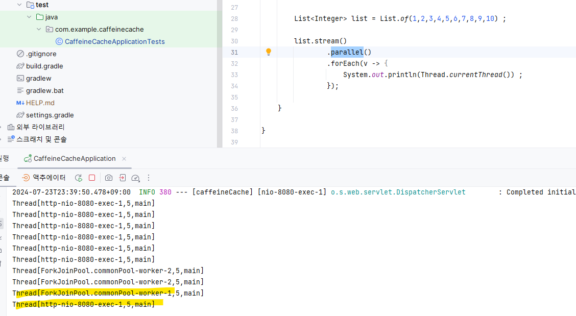 - 이는 해당 로직이 가장 처음 수행될 때 ForkJoinPool의 사용 가능한 Thread가 있는 지 확인해보고 없으면 생성하는 방식으로 사용된다.